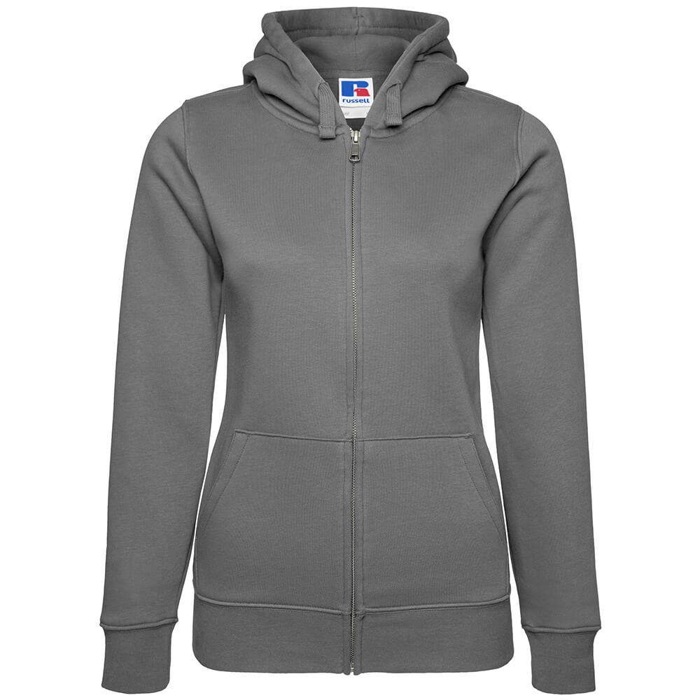 Nicht nur feminin geschnittene Kleider oder T-Shirts stehen auf der Wunschliste von Frauen ganz oben. Auch Sweatjacken dürfen gerne eine moderne Passform aufweisen. Die Authentic Kapuzen-Sweatjacke von Russell weist diese Eigenschaft auf. Der 3-lagige Sweatshirt-Stoff (Oberstoff: 100% Baumwolle) ist robust und das zeitgemäße Erscheinungsbild überzeugt. Die Sweatjacke ist in vielen Farben erhältlich und auch die Veredelung bietet zahlreiche Möglichkeiten. Durch den verdeckten, messingfarbenen YKK-Reißverschluss ist eine vollflächige Veredelung möglich. Zum netten Gimmick werden die zwei aufgesetzten Taschen.