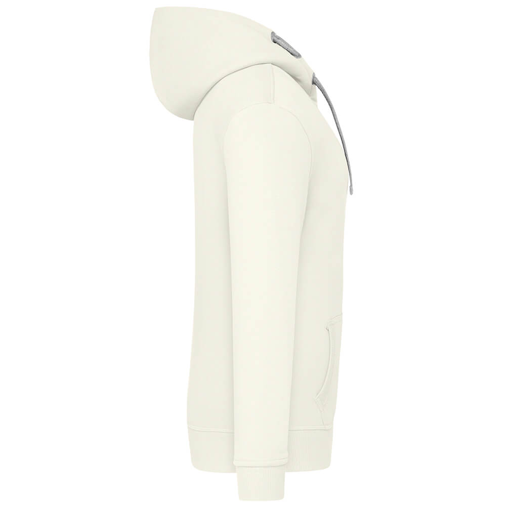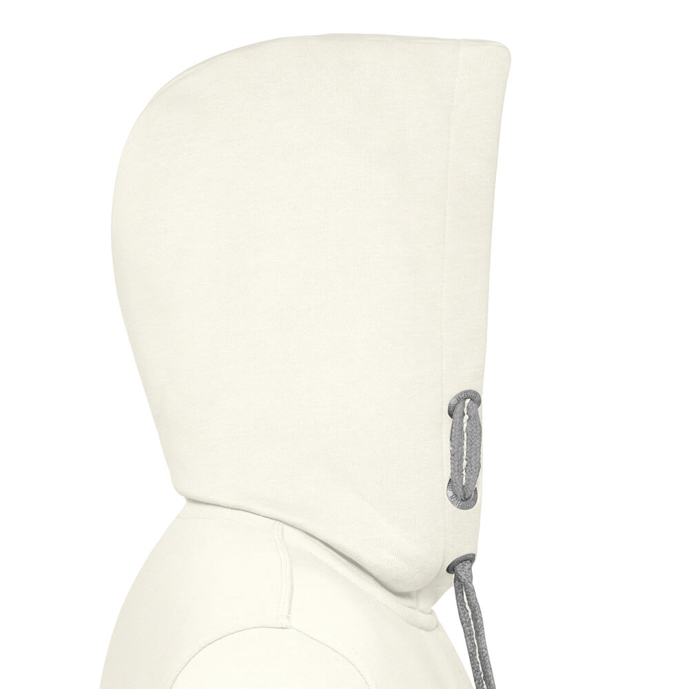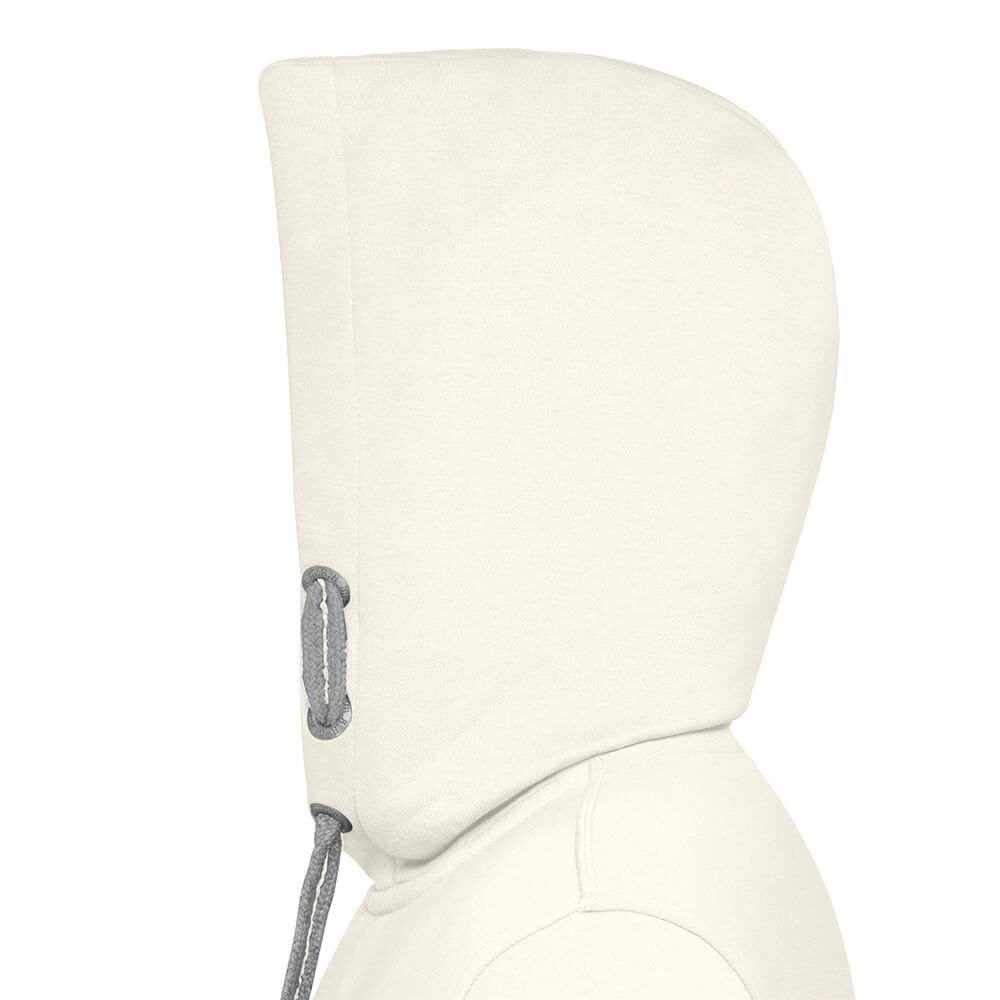 Die Kapuze der Jacke in Übergröße ist mit einer flachen, mittig bestickten Kordel ausgestattet. Auch das Innenfutter erstrahlt in Kontrastfarbe. Beidseitig sind bei der Kapuzenjacke drei HRM-Metall-Ösen verarbeitet und der hochwertige Reißverschluss lässt sich mit einem dekorativen HRM-Metall-Zipper regulieren. Abschluss und Saum von Ärmeln und Taschen sind mit 2x2 Ripp-Strick-Bündchen versehen worden und in der linken Seitennaht ist ein gewebtes Fair4All Flaglabel zu finden.