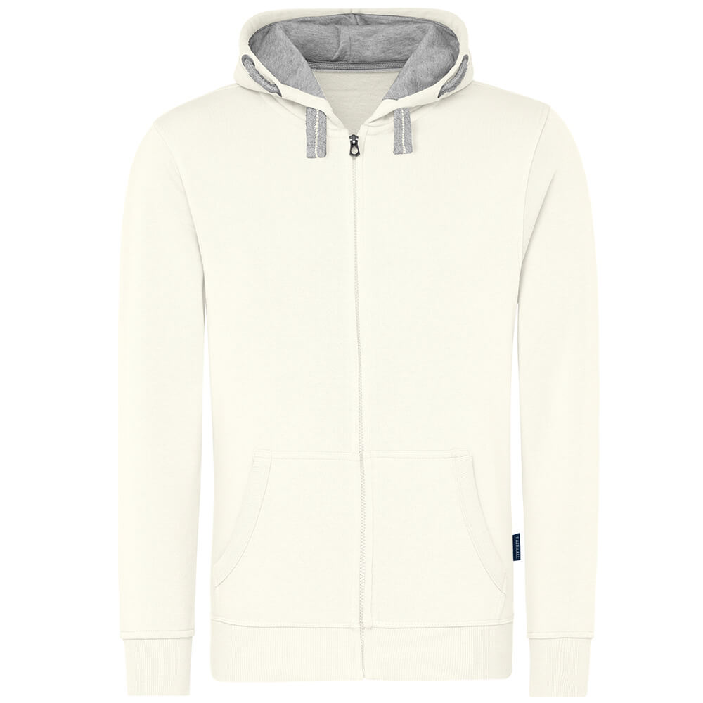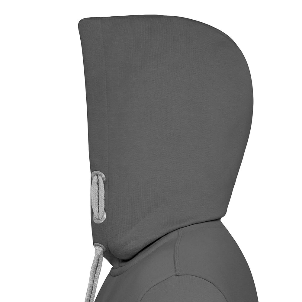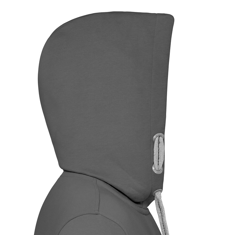 Die Kapuze der Jacke in Übergröße ist mit einer flachen, mittig bestickten Kordel ausgestattet. Auch das Innenfutter erstrahlt in Kontrastfarbe. Beidseitig sind bei der Kapuzenjacke drei HRM-Metall-Ösen verarbeitet und der hochwertige Reißverschluss lässt sich mit einem dekorativen HRM-Metall-Zipper regulieren. Abschluss und Saum von Ärmeln und Taschen sind mit 2x2 Ripp-Strick-Bündchen versehen worden und in der linken Seitennaht ist ein gewebtes Fair4All Flaglabel zu finden.